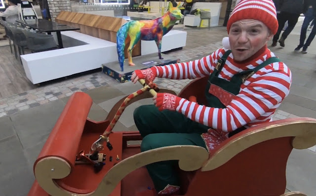 A naughty pair of Elves ride their powered sleigh through Food Central at Fosse Park in Leicester, handing out candy and generally being mischievous.
